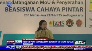 Menteri Koordinator Pembangunan Manusia dan Kebudayaan Puan Maharani menyerahkan beasiswa cahaya pintar Perusahaan Listrik Negara kepada 200 ...